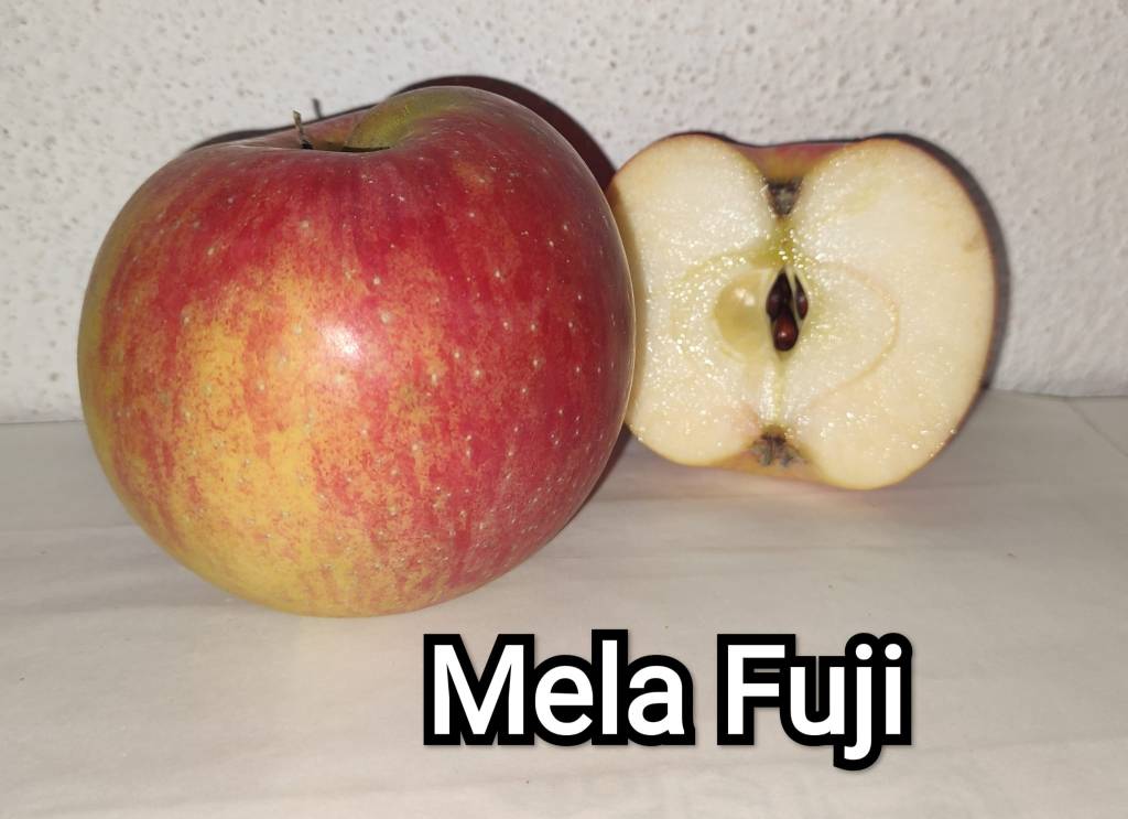 Mela Fuji : mela di origine giapponese, è il risultato dell’incrocio delle varietà «Ralls Janet» e «Red Delicious» .Ha forma tondeggiante, buccia rossa, con delle striature tendenti più all’arancione, polpa croccante e succosa,dal sapore dolce ed è ricca di vitamine B ,fruttosio, fosforo, zinco, calcio e ferro. Inoltre dato il grande quantitativo di acqua e di succo, queste mele possono aiutare in modo naturale la diuresi. Le mele Fuji hanno una dimensione da grandi a molto grandi.